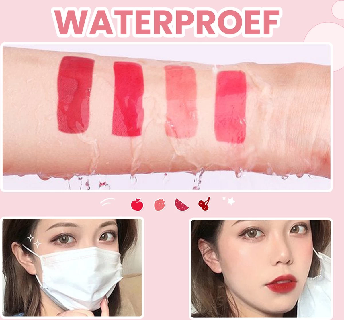 Wil je de hele dag door mooi gekleurde lippen en wangen? Met deze lip en cheek tint hoef je je nooit meer zorgen te maken over eten en drinken met lipgloss op. De lip tint is 100% waterproof, en blijft tot wel 24 uur zitten! Je kan er mee eten, drinken, wat je maar wilt, het gaat er niet af!