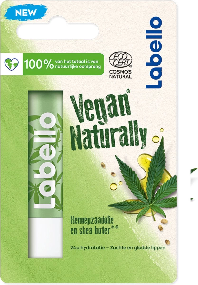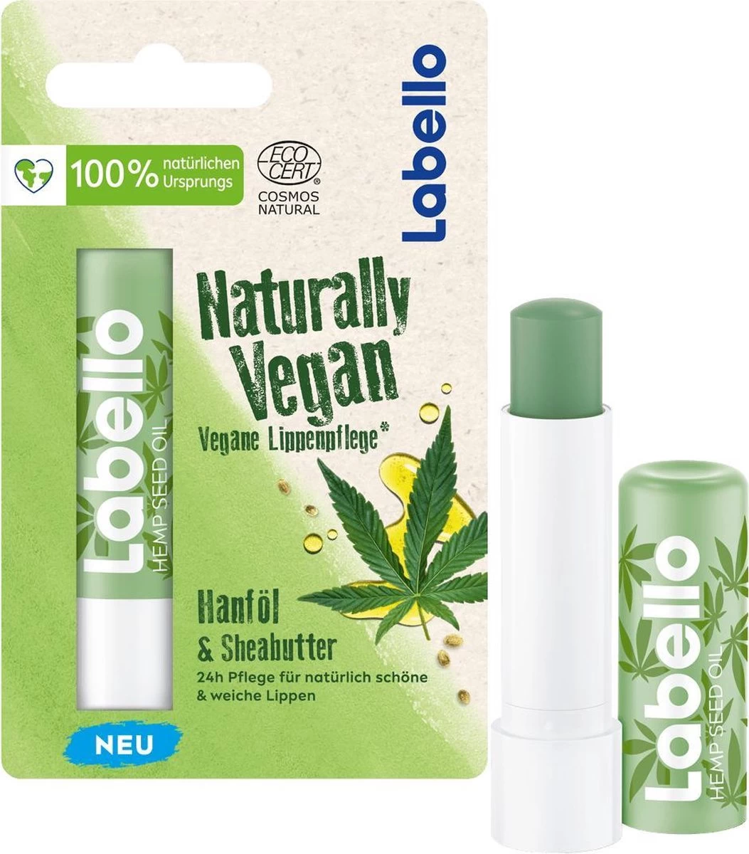 Labello Vegan Naturally Hennepzaadolie / Huile De Graines De Chanvre / Hemp Seed Oil, verzorgende lippenbalsem met een frisse hennep geur en een subtiele glans.