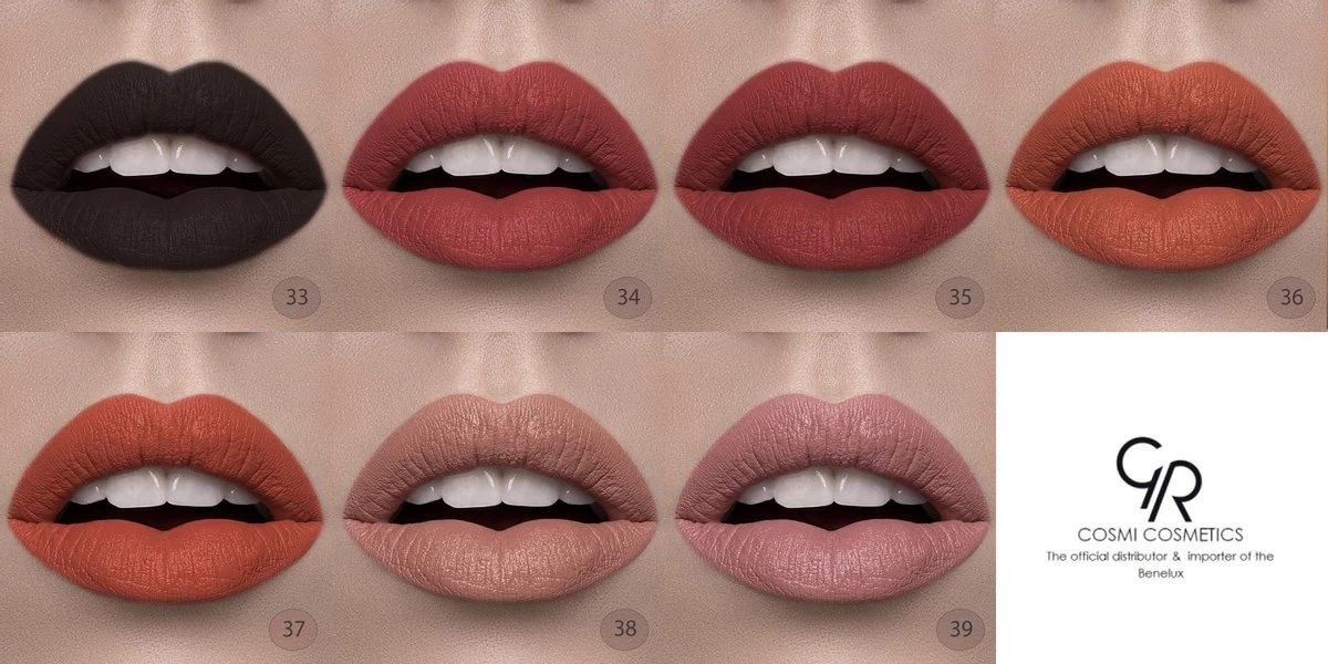 Golden Rose Matte Lipstick Velvet creëert met zijn hoge kleurpigment en slijtvaste formule een matte fluwelen uitstraling op de lippen. Je lippen worden gehydrateerd door toevoeging van vitamine E.